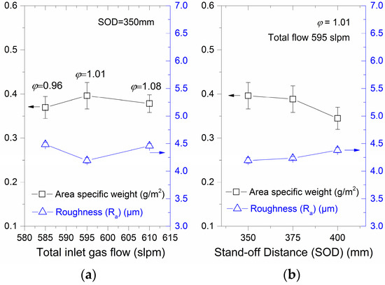 Using this optimum fuel/oxygen mixture, the Yb2Si2O7 coatings were also sprayed at different stand-off distances (SODs) (Figure 2b). The SOD < 350 mm yielded lower ASW values of the coatings and thus these results are not shown in the graph. Furthermore, almost no difference was observed by increasing the SOD from 350 mm to 375 mm. However, a slight decrease in the ASW and a simultaneous increase in the roughness were obtained at 400 mm SOD. The effect of the SOD will be further discussed below.