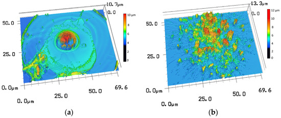 3D-surface morphology of HVOF-sprayed (a) molten (φ = 1.01) and (b) non-molten (φ = 0.96) Yb2Si2O7 single splats on Si wafer. The images were produced using a confocal laser microscope.