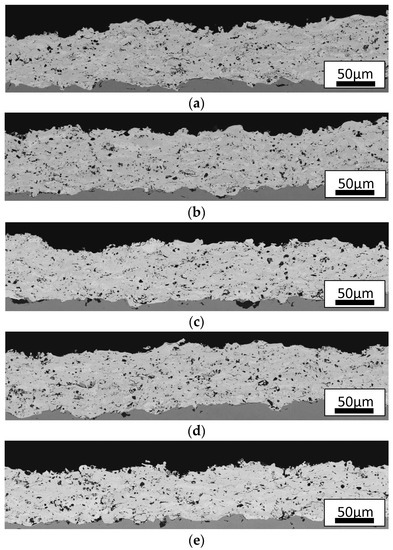 Figure 5a–e shows the low magnification cross-section microstructures of five Yb2Si2O7 coatings sprayed with different total flow rates and SODs, and the measured porosity of these coatings via image analysis are given in. The microstructures of all coatings were found to be fairly dense and similar. Nevertheless, the lowest porosity content was measured at φ = 1.01 with 350 mm SOD (#2). This finding confirms the prior discussions regarding the highest ASW and the lowest roughness recorded due to well-molten particles with the same spray parameters. On the other hand, the highest porosity was measured at φ = 1.01 with 400 mm SOD (#5). Obviously, particles start to significantly cool down/slow down beyond 375 mm and more particles bounce off the substrate. Supportively, Figure 5e reveals a thinner coating with a rougher surface finish due to the presence of a high amount of non-molten or partially molten particles in the microstructure.