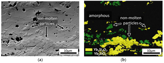 The crystalline/non-crystalline areas in the coatings were also investigated by an EBSD analysis. The analysis was performed on the cross-section of the HVOF sprayed coating #2 as an example (Figure 7a,b). The non-molten/partially molten particles embedded in a molten and well-bonded coating matrix are observed in Figure 7a, and Figure 7b shows a phase map of the same coating area. The latter clearly demonstrates that the molten matrix is non-crystalline and hence yields no diffraction (black regions), whereas the non-molten particles preserved their crystallinity. The Yb2Si2O7 and Yb2SiO5 phases were indexed for these non-molten particles, supporting the XRD analysis results.