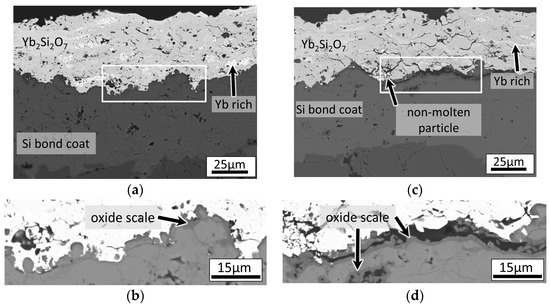 Backscattered SEM micrographs of EBC cross-section after five cycles between 1200 °C and room temperature with 20 h high temperature dwell time. Images (a,c) are taken from the different regions of the same sample. White rectangles in (a,c) indicate the region of high-magnification images shown below (b,d), in which oxidation of the silicon coating at the Si/Yb2Si2O7 interface as well as on the pore surfaces is clearly visible via darker image contrast.