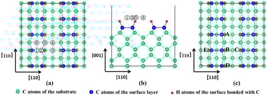 Prior to calculating atom migration, a lattice constant of 0.3568 nm was determined by adjusting the calculation parameters to optimize the diamond crystalline structure, in which the plane-wave cut-off energy was 350 eV. The calculated lattice constant was close to the experimental value of 0.3567 nm. A 4 × 4 × (8 + 1 + 8) slab composed of eight carbon layers (with 16 carbon atoms per plane), one hydrogen layer, and eight vacuum layers was used to model the hydrogen-terminated diamond (001) film, as shown in Figure 1. The height of the vacuum layer was approximately 0.8020 nm, and a periodically arranged interference was prevented. The hydrogen-terminated diamond (001) film model was selected because of the abutment of hydrogen atoms on the surface in the diamond film synthesis []. During relaxation, the three bottom layers of carbon atoms were fixed, whereas the others moved freely. After relaxation, the hydrogen-terminated diamond (001) surface underwent reconstruction. The length of the dimer bond was 0.162 nm, the bond length between the surface carbon atom and the hydrogen atom was 0.102 nm, and the total energy of the configuration was −1164.233 eV.