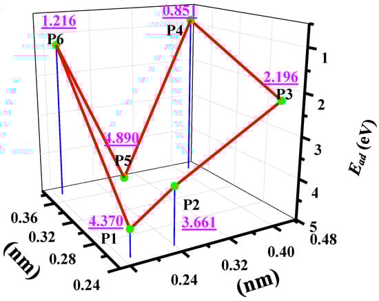 When Hydrogen B was abstracted Figure 1c, the configuration represented the model of a hydrogen-terminated diamond (001) slab with one open radical site (denoted 1ORS). The charge analysis shows that when a hydrogen atom bonded with the surface carbon atom (CNN) was removed, the total magnetic moment of CNN changed from 0.000 to 0.412 μB, implying that the CNN had unpaired electrons and was more reactive. The total energy of the configuration of 1ORS Eslab is −1158.567 eV. The total energies of the configurations were calculated to study the adsorption of a boron atom at the six symmetrical positions. The relevant adsorption energies were obtained using Equation (1). The total energies and adsorption energies of a single boron atom on the hydrogen-terminated diamond (001) surface with one open radical site are listed in Table 4, and the PES of the adsorption energies is displayed in Figure 2.