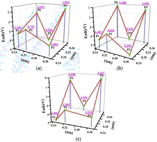 As shown in Figure 1c, when Atoms A and B were abstracted, the configuration represented the model of a hydrogen-terminated diamond (001) slab with two open radical sites along the dimer row (denoted as 2ORS-R). The total energy of the configuration of 2ORS-R Eslab is −1152.921eV. The total energies of the configurations of a single boron atom on 2ORS-R were calculated to study the adsorption of a boron atom at the six symmetrical positions. The relevant adsorption energies were obtained using Equation (1). The total energies and adsorption energies of a single boron atom on the hydrogen-terminated diamond (001) surface with two open radical site are listed in Table 6 and the PES of the adsorption energies is displayed in Figure 4a–c.