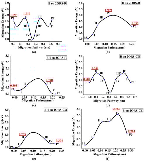 The migration energies along the path were calculated using the NEB method in the VASP code. The calculation results are listed in Table 7, and the minimum energy path curve is presented in Figure 5. The minimum energy path curve in Figure 5a shows a deep basin between two shallow basins. The boron atom on the configuration of 2ORS-R will slide to a shallow basin and overcomes an energy barrier of 0.54 eV from P1 to P5. However, the migration energy barrier of the boron atom from P5 to P1 is 1.71 eV. The energy barrier of the boron atom from P5 to P3 is 1.94 eV (Figure 5b). At P3, the boron atom abstracted a hydrogen atom and formed a BH radical. The migration of the BH radical from P3 to P5 is very easy because of the low energy barrier of 0.74 eV, as shown in Figure 5c.