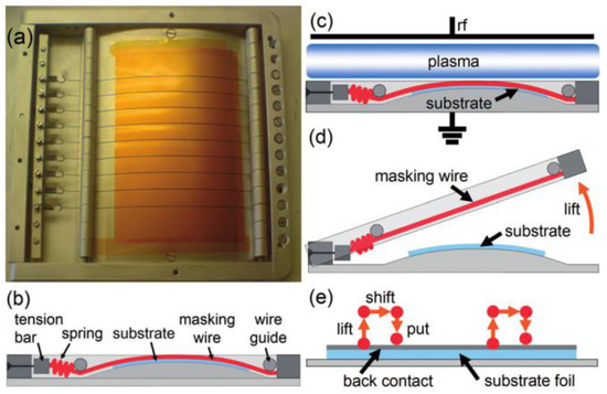 In situ series connection of PECVD silicon solar cells on polymer film: Masking wires are shifted laterally between the deposition steps for silicon and contacts (evaporated metal and sputtered ZnO). Insulating intrinsic amorphous silicon isolates the back contacts of adjacent cells from each other. (Reproduced from [61] with permission from Taylor & Francis Ltd., Abingdon, Oxford, UK) (a,b) photograph and diagrammatic cross-section of the substrate holder used for static substrate tests; (c,d) show how tensioned masking wires hold the substrate in position within the deposition chamber, but can be lifted for repositioning between coating layers; (e) shows the sequence of wire lifting, shifting, and replacement; and (f) diagrammatic cross-section of three series connected cells indicating the successive mask shifts used in the deposition sequence.