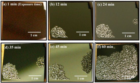Photographs of the deposited Cu3N/Si film after exposure to ambient air are displayed in Figure 1. Photographs were taken at intervals of about 10–15 min. Gradual changes of the surface morphology with time are noted. Similar changes are observed for films deposited on glass substrates (not shown here). Figure 1a was taken right after the film was exposed to ambient air at room temperature (≈295 K). Self-buckling of the deposited films was observed after about 12 min (Figure 1b). The buckled area increased gradually with time (Figure 1b–e). Almost the entire film surface was buckled after 90 min, as is obvious from Figure 1f. The buckled area as a function of time is displayed in Figure 2.