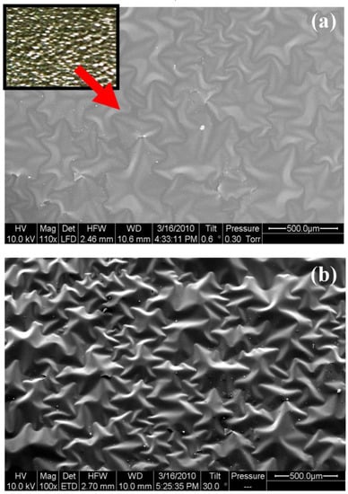 Figure 3 shows the SEM picture of the buckled Cu3N surface area. Random ripple structures are observed at tilt angles of 0.6° and 30°. This shows that the film surface is partially taking off towards upwards directions from the substrate, and empty spaces or voids in between the film and the underlying substrate are created. The observed ripple structure is caused by this empty space. Nevertheless, the film still firmly adheres to the substrate. Apparently, the film properties change when exposed to air at atmospheric pressure, which leads to buckling and a partial peeling off the substrate.