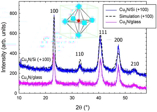 Measured and simulated (solid line) X-ray diffraction pattern of polycrystalline Cu3N films deposited on a Si and on a glass substrate. Simulation results (dashed line) are also shown for the Cu3N/Si data. To ease comparison, the Cu3N/Si data spectra have been shifted upwards by +100.