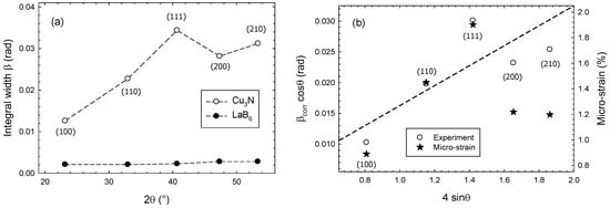 (a) Integral width β of Cu3N and reference material LaB6 vs. diffraction angle. LaB6 (SRM 660b) is used for the determination of the instrument profile function; (b) Williamson–Hall analysis and the extracted micro-strain of the Cu3N thin film. Dashed line is added to guide the eye only.