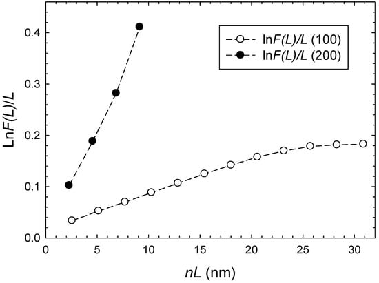 and where θ1 and θ2 define the angular range for the experimentally observable line profile, λ is the X-ray wavelength of Cu Kα radiation, and where the integers n are the harmonics of the Fourier coefficients. The logarithm of F(L) can be expressed as [30]