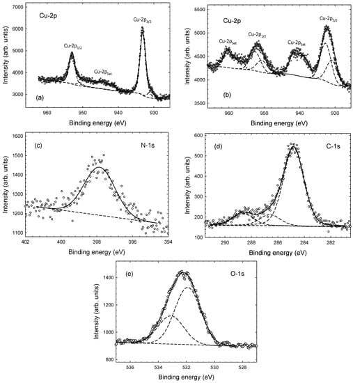 Figure 7a displays the Cu-2p spectrum for the as-deposited CuxN film on a Si substrate; it was measured after the sample had been taken out of the deposition chamber and exposed to ambient air. Figure 7b displays the same Cu-2p region for a CuxN film on a glass substrate after five years in ambient air. Both spectra show the Cu-2p1/2 and Cu-2p3/2 peaks. In addition, there are Cu shake-up satellite lines which are attributed to copper oxide Cu(II)O [35]. Some differences are immediately noted. Most significantly, the width of the Cu-2p peak is 2 eV and 4.4 eV (Figure 7a,b, respectively), significantly different for the two samples. In addition, the intensity of the satellite peaks is larger in Figure 7b compared to Figure 7a. The observations are attributed to the larger oxygen content at the film surface of the CuxN/glass sample, presumably due to the much longer time in air. The strong appearance of the satellite lines provides evidence that a significant fraction of the surface copper is oxidised.