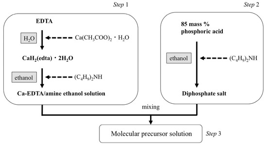 Y-TZP was coated with CA film using the molecular precursor method as previously described [11]. The molecular precursor solution was adjusted in three steps as shown in Figure 1. Briefly, step 1: Preparation of a calcium-EDTA/amine ethanol solution; step 2: Preparation of dibutylammonium diphosphate salt (((C4H9)2NH2)2P2O6·2H2O); step 3: Preparation of the molecular precursor solution by adding dibutylammonium diphosphate salt to calcium-EDTA/amine ethanol solution with an adjustment of Ca/P to 1.67 (calcium ion concentration = 0.25 mmol/g).