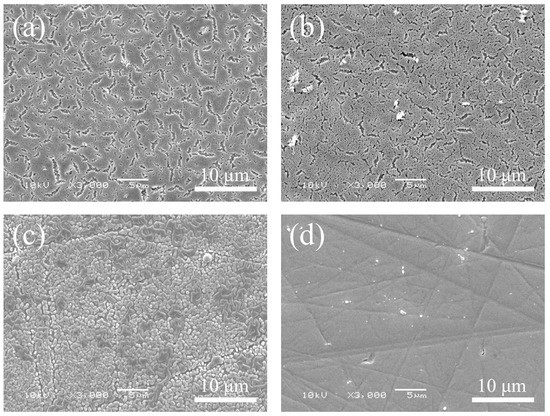 SEM images of the surfaces of (a) 600 °C-2 h, (b) 800 °C-2 h, (c) 1000 °C-2 h, and (d) 600 °C-4 h Y-TZP disks.