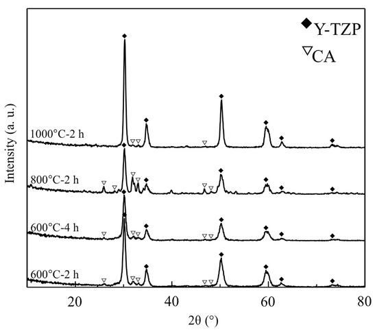 As the molecular precursor method is a wet process, it is possible to coat any complex shapes. Hayakawa et al. and Amemiya et al. processed CA coating on not only the surface but also the inside of a three-dimensional titanium fiber structure [12,13]. Takahashi et al. [11] investigated the influence of heating temperature on the fabrication of CA coating on titanium. They examined the crystal structure of CA coating at heating temperatures of 300, 400, 500, 600, and 700 °C. Below 500 °C, the amorphous phase of CA coating was dominant and few crystal structures of CA coating were identified. At heating temperatures of 600 and 700 °C, a higher degree of crystallinity of CA coating was obtained. However, heat treatment above 700 °C seemed to cause a phase transition of titanium [14]. They concluded that a heating temperature of 600 °C is suitable for producing an adherent CA film on titanium. Our previous study employed a heating temperature at 600 °C according to the results for titanium [9]. However, Y-TZP is more stable than titanium at temperatures higher than 600–700 °C. A higher heating temperature and longer heating time should result in higher crystallinity of the CA coating.