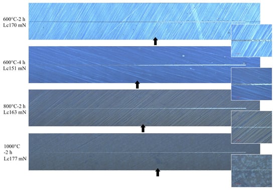 Table 4 shows Lc values obtained by the scratch test and Figure 5 shows panoramic images of the scratch trace and the images at the first crack in the coating in a representative sample. No significant differences were recognized in the Lc values among the four different samples (p > 0.05). The panoramic image of the scratch test revealed that clearer break down of the coating film was recognized at the position of the first crack for 600 °C-2 h and 600 °C-4 h than for 800 °C-2 h and 1000 °C-2 h disks.