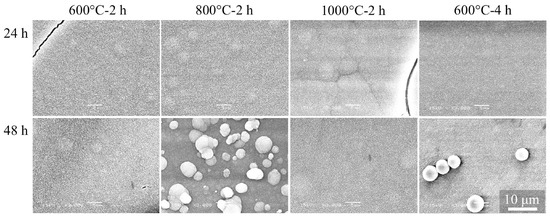 SEM images of the Y-TZP disks from four heating conditions after 24 and 48 h of HBSS immersion.