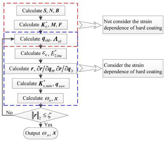where is the two-norm of the residual vector r and ζ is the solution precision. When the residual vector r of Equation (56) satisfies the condition of the solution precision, the newest global complex stiffness matrix at ε strain (in Equation (49)) and the normalized response vector qnew can be output. Then, the n-order nonlinear resonant circular frequency ωn and the nonlinear harmonic response x can be obtained, respectively, by:
