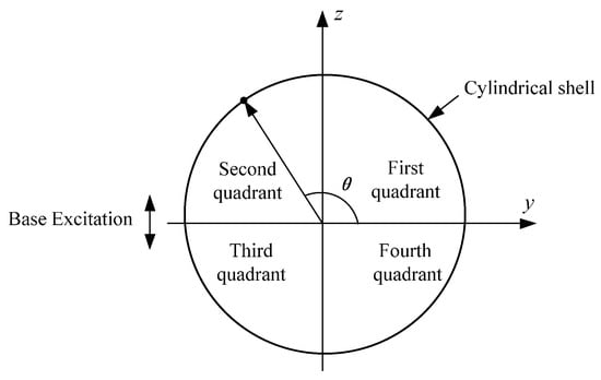 To simulate the vibration during the aero engine or aircraft working, the hard-coating cylindrical shell is forced in the horizontal direction by a sinusoidal base excitation. Assume that the absolute acceleration of the base is along the z direction in the Cartesian coordinate system (see Figure 3). Converting it into the orthogonal curvilinear coordinate system, one can obtain the values of the influence coefficients μx, μθ and μz in different quadrants. The μx is equal to zero; the values of μθ and μz are listed in Table 3.