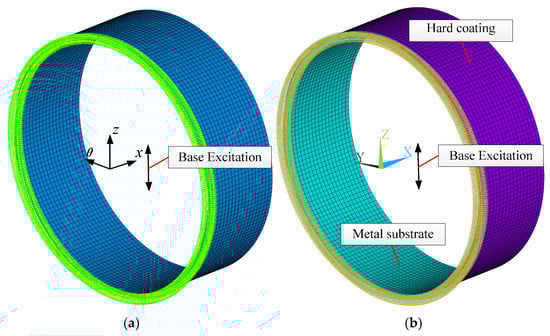 The finite element models with element size 5 mm corresponding to the proposed method and the FEIM are shown in Figure 4, which contains 3496 and 6992 elements in total, respectively. The initial base excitation level is set to 1 g. Besides, all nodes at the bottom of the hard-coating cylindrical shell are constrained in all degrees of freedom to represent the clamped-free boundary condition. It should be noted that the finite element model of the FEIM contains two layers of the element, which are coupled together to describe the connection of the hard-coating and metal substrate [].