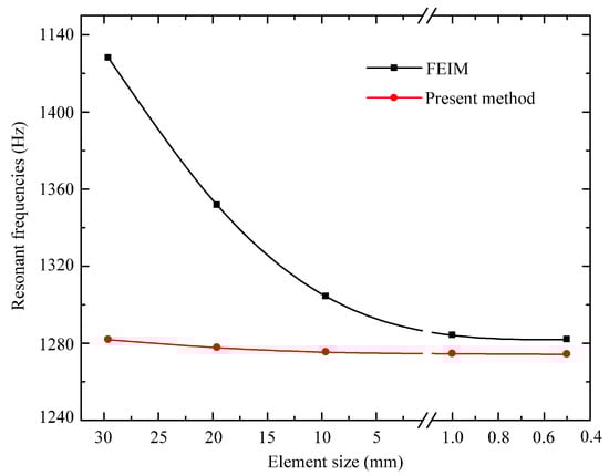 Based on the new finite element formulation, the whole process of nonlinear vibration analysis of the hard-coating cylindrical shell is implemented by a MATLAB (MathWorks Inc., Natick, MA, USA) self-made finite element program. The numerical results of the hard-coating cylindrical shell will now be compared with the FEIM, which applied the Shell281 element of ANSYS (ANSYS Inc., Canonsburg, PA, USA) to calculate the element matrices of stiffness, mass and damping. Numerical experiences indicate that the appropriate results can only be obtained with fine enough meshing. Thus, different element sizes are used to solve the nonlinear resonant frequency of the hard-coating cylindrical shell by the FEIM and the present method, respectively. The comparison of the convergences of the first order nonlinear resonant frequencies under different element sizes is shown in Figure 5, which indicates that the developed finite element method is less affected by the element size and has lower computing cost. The advantages become more obvious when solving the nonlinear resonant response spectrums of the hard-coating cylindrical shell, because its calculation process can be regarded as a combination of a number of nonlinear resonant frequency calculation processes, which have a basically consistent iterative method.