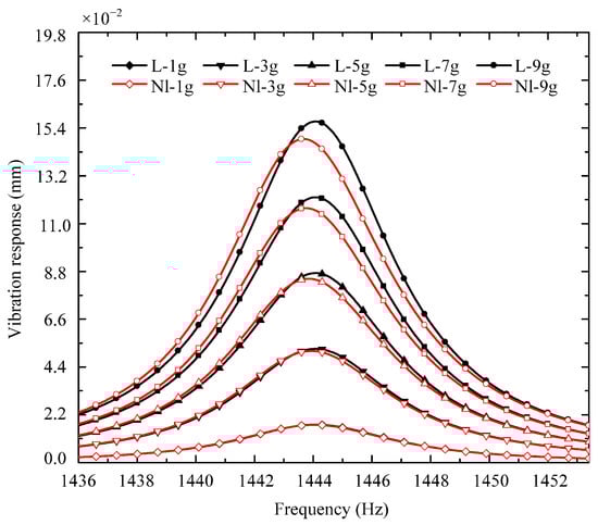 The first six order linear and nonlinear resonant frequencies and responses of the hard-coating cylindrical shell under a 5 g excitation level are listed in Table 5 and Table 6. Then, the three-order linear and nonlinear resonant frequencies and responses of the hard-coating cylindrical shell under different excitation levels are listed in Table 7 and Table 8. Moreover, the three-order frequency response spectrums of the hard-coating cylindrical shell are shown in Figure 6. It should be noted that the legend L represents the linear vibration response, and the legend Nl represents the nonlinear vibration response.