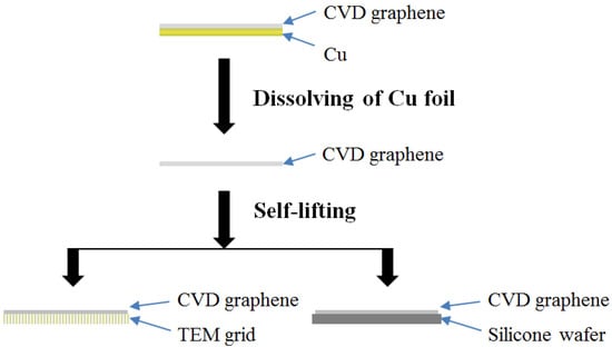 Transmission electron microscopy (TEM) images and selected area electron diffraction (SAED) of the CVD graphene film were obtained using a transmission electron microscope (JEOL JEM 2100F, JEOL Ltd., Tokyo, Japan). The atomic force microscopy (AFM) images were obtained using an Agilent 5500 AFM/STM microscope in AC mode with NSC 15/AlBS probes (resonant frequency of 325 kHz) from MikroMasch USA (Wilsonville, OR, USA) under ambient conditions. The flow chart for preparing the graphene sample for TEM and AFM analysis is shown in Figure 2. After dissolving the copper substrates in the Marbles reagent, the floating CVD graphene film was rinsed with DI water to remove contamination and to clean the surface before transferring it onto a lacey carbon TEM grid (300 mesh, Copper) for TEM analysis and a silicon wafer for AFM analysis.