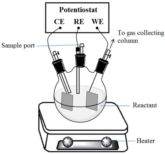 Schematic of the three-neck eU2A reactor. The working electrodes are Ni foil and graphene-coated Ni and the counter electrode is Pt foil, while the reference electrode is Hg/HgO. Temperature was set at 70 °C. The sample port allowed collecting liquid samples and determining pH of the electrolyte in the reactor.