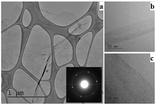 The nature of the graphene film is shown by TEM in Figure 4. The image (Figure 4a) represents a continuous graphene film over a large area on the TEM grid with wrinkles and overlapping which were introduced due to the transfer process. The SAED image (inset in Figure 4a) reveals the six diffraction spots depicting the hexagonal diffraction pattern and the crystalline structure of the coal derived graphene films. Two or more layers of graphene are shown (Figure 4b,c) on the edge of the film.
