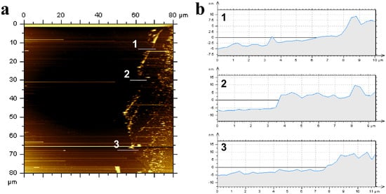 The AFM image (Figure 5a) shows the continuous graphene film on silicon substrate. Line scans were performed on the various regions of graphene films to determine the thickness, as depicted in the AFM image (Figure 5a). The corresponding height profiles (Figure 5b) show that the thickness is ~5–15 nm across the line scans, suggesting the formation of few layer graphene films. The brighter areas (with greater thickness) in the AFM image are caused by back-folding and/or overlapping which can be clearly observed in the TEM analysis.