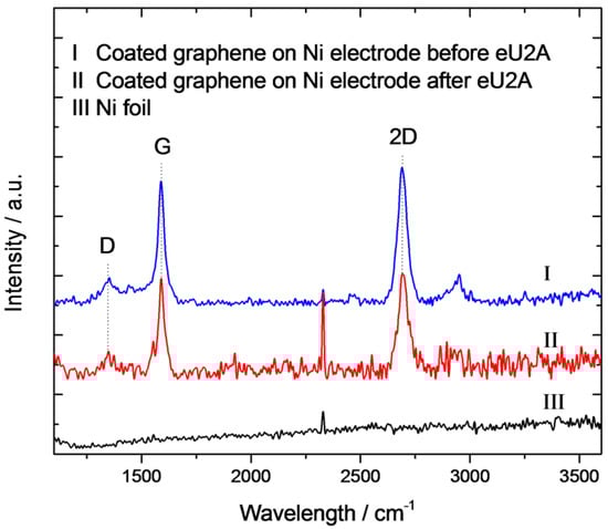 The Raman spectra of the graphene on the surface of the Ni electrode were obtained before and after the eU2A experiments (Figure 6, curves I and II). In both cases, the Raman spectra exhibited a D band at 1360 cm−1, a zone-boundary phonon mode in first order Raman spectra attributed to the defects in the graphene films []; a G band at 1585 cm−1, assigned to the tangential vibrations of sp2 bonded carbon atoms []; and a 2D band at 2700 cm−1, a boundary phonon mode in second order Raman spectra associated with graphene []. The ratio of the intensity of the 2D band to the G band (I2D/IG) is approximately 1, indicating that the coated graphene is bi-layered to few-layered graphene films [,,,,], which is in agreement with the TEM and AFM analysis. The consistency of the Raman spectra of the coated graphene before and after the experiments implies that the graphene coating is stable during the eU2A process. In contrast, no D, G, and 2D bands are found in the Raman spectrum of the bare Ni electrode (Figure 6 curve III).