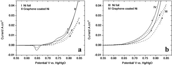 The normalized (by active geometric area of the electrodes) cyclic voltammograms (CVs) of 2.5 M K2CO3 in the absence and presence of 5.0 M urea at 70 °C using Ni foil and graphene-coated Ni, at a scan rate of 10 mV s−1, are shown in Figure 7. The CVs illustrate an anodic and cathodic peak in relation to the NiOOH/Ni(OH)2 redox couple (Equation (2)) for both working electrodes.
