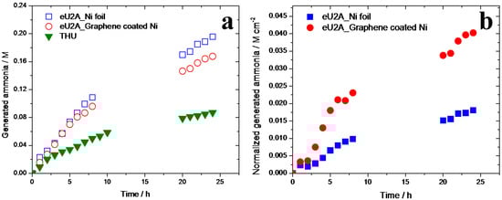 The generated ammonia during 24 h eU2A (0.750 V vs. Hg/HgO) using graphene-coated Ni and bare Ni working electrodes and THU experiment is shown in Figure 8a. The generated ammonia on the electrode surface in the eU2A experiments is the total ammonia produced excluding the ammonia produced in the bulk solution (THU) as calculated by Equation (3). The normalized generated ammonia per surface area of the electrode is then calculated according to Equation (4) and the results are shown in Figure 8b.
