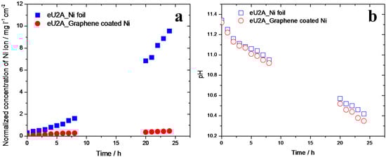 (a) Normalized concentration of Ni ion (per cm2 of the working electrode) in the electrolyte during 24 h eU2A experiments using Ni foil and graphene-coated Ni working electrodes. (b) pH change during eU2A reactions using Ni foil and graphene-coated Ni. The pH value of the electrolyte is time dependent; pH value is reduced in the eU2A process due to the transformation of K2CO3 to KHCO3 by the generated CO2 from eU2A reaction. With the help of graphene coating, the normalized Ni loss per surface area was reduced by ~20 times.