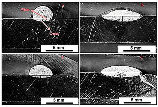 Figure 2a–d shows stereo images of selected samples of the composite coating processed under various conditions. Some of them have inclusions. According to the cross section of the welds, the dilution of the weld lines can be assessed. It also should be noted that the thicknesses of all coatings were between 3 and 4 mm, which is not directly the scope of this study. The amount of heat generated in the TIG process is directly related to the current and voltage and inversely related to the welding speed; thus, with the current increasing and the speed decreasing, due to increases in internal heat, more particles will be dissolved and fewer inclusions will thus be formed. As an example, at a speed of 3.17 mm/s and a current of 120 A, because of a small amount of heat, some inclusions were observed; therefore, before the dissolution of all particles, solidification occurred, and these particles remained in the sample. However, at a speed of 2.1 mm/s and a current of 120 A, particles have enough time to dissolve. This is due to the fact that internal heat is high and solidification time is relatively long.