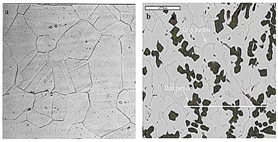 The microstructure of the substrate (304 SS) and coating is respectively shown in Figure 3a,b. The shown coated sample was produced using a speed of 3.17 mm/s and a current of 120 A. A visible difference between the substrate and coated samples can be observed. There are a series of dark particles with areas of gray fragments in the matrix.