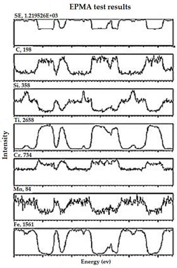 Figure 4 presents the chemical analysis of these black particles carried out with an EPMA (Electron Probe Micro Analyzer, Tehran, Iran). As can be seen, the dark particles contain carbon, titanium, and a small amount of chromium: The presence of chromium in the coating is due to its high 304 SS content. It seems that the black segments are the mixtures of titanium and chromium carbides. A series of fine dark areas that have been spread across the coating, and are rich in carbon and titanium can also be seen in the image. These are in fact the super saturated titanium carbide [].