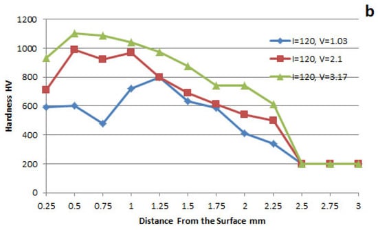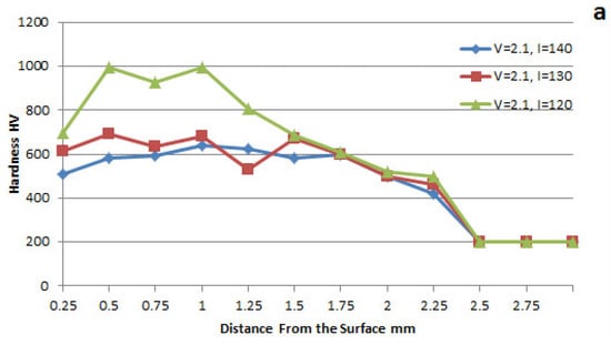 Though the trend of hardness across the coating thickness is similar for all current densities, the variation in hardness across the thickness is different. For instance, the hardness trend corresponding to a 0.8 mm thickness shows an increase in hardness when the current is 120 A, while the hardness shows a downward trend when the current is 140 A. This discrepancy can be attributed to the variation in the composition of the coating, which is apparent from Figure 3a,b.