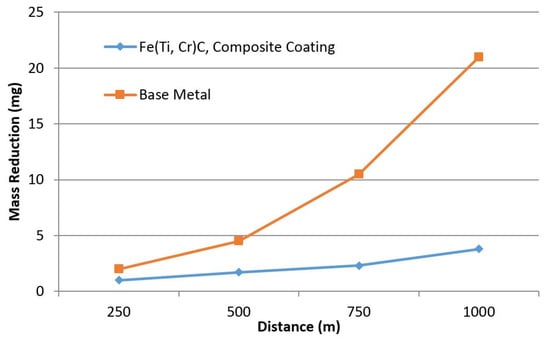 Figure 7 compares the amount of mass reduction in the base metal and composite coating produced with a 120 A current and a 3.17 mm/s travel speed. At the beginning, the difference in the wear of the two samples was not significant; however, the wear of the base metal visibly increases with time. For the distance of 1000 mm, the coating experiences 4.5 times (or 450%) more wear than the base metal does. Obviously, the high wear performance of the coating is due to the presence of the hard particles of TiC.