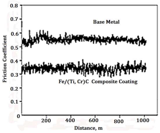 Figure 8 presents the friction behavior of the substrate and the coating. As can be seen, both the substrate and the coating show consistent friction behavior over distance. However, the friction co-efficient of the coating is about 1.6 times smaller (or 37%) than that of the substrate. Again, the superior performance of the coating is due to its having a mixture of hard particles TiC/Cr23C6, based on the results of Figure 4 and Figure 5. These hard phases act as a lubricant and reduce the friction between the two surfaces.