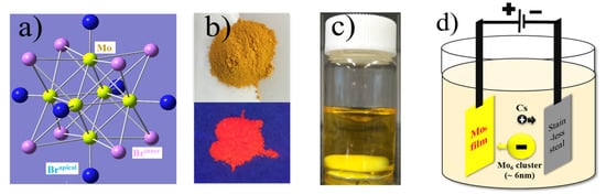 Photographs and schematic illustrations showing the experimental setup: (a) chemical structure of the Mo6 cluster; (b) as prepared the Cs2Mo6Br14 powder with and without irradiation at 324 nm wavelength of UV light; (c) suspension of the Cs2Mo6Br14 powder in MEK solution; (d) EPD apparatus, diameter of the Mo6 cluster is about 6 nm [].