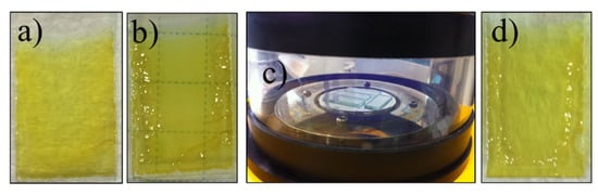 Photographs showing the influence of hydrophilic plasma treatment of the ITO surface on the adhesion of the Mo6 cluster films: (a) Mo6 film on the untreated ITO glass just after the EPD (similar image are obtained on plasma-treated ITO glass); (b) after 4 days; (c) the plasma treatment of the ITO glass and (d) Mo6 film on the plasma-treated ITO glass after 9 days.