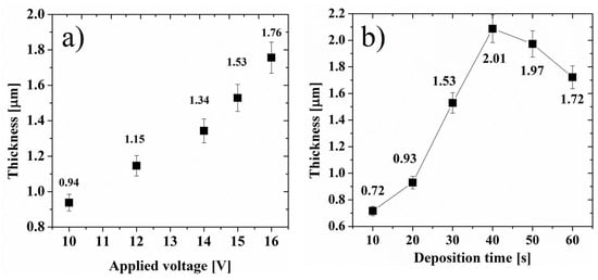 The thickness of the deposited Mo6 cluster film with hydrophilized-ITO glass versus (a) the applied voltages (fixed for 30 s) and (b) deposition time (fixed at 15 V).
