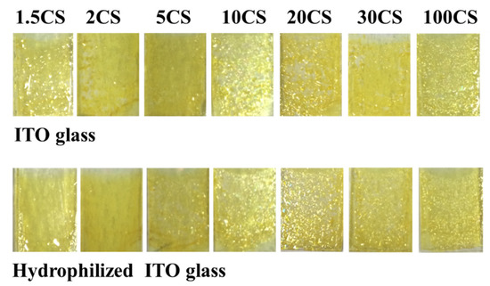 The Mo6 films prepared by the EPD process at 15 V for 30 s were coated by the PDMS fluids on the surface without any treatment after drying for 10 min. Photos of the PDMS-coated Mo6 films on the ITO glass with and without hydrophilization are shown in Figure 4. Only the Mo6 films deposited on the hydrophilized ITO glass followed by coating with the KF-96L-1.5CS and KF-96L-2CS exhibited an insignificant cracking. Most of the other films strongly cracked during drying. Even though, the PDMS-coated films were dried at 40 °C for 7 days, the PDMS fluids containing the viscosity higher than 2 centistokes still existed on the surface of the film accompanying with many flakes that completely separated from the ITO surface. The problems exhibited that the viscosity of the PDMS fluid decided the drying process. The films coated with low-viscosity PDMS fluids obtained volatilized appearance, but the surface of the Mo6 film was not stable. For this result, the optimal time to coat the PDMS fluid after the EPD process was investigated.