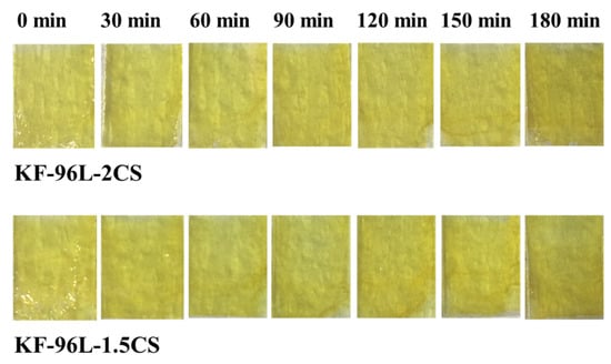 Based on these results, KF-96L-1.5CS and KF-96L-2CS were selected to investigate the optimal conditions for the coating because they were dried completely. The Mo6 film deposited at 15 V for 30 s on the hydrophilized ITO glass were coated with KF-96L-1.5CS or KF-96L-2CS for 0, 30, 60, 90, 120, 150, or 180 min after finishing the EPD (Figure 5). The evaporation speed of the PDMS fluid during drying affects the stabilization of the Mo6 film. In order to minimize the residual stress during the evaporation, all the films were slowly dried at room temperature for 24 h. The results based on the visual observation of the photos shown in Figure 5 indicated that 90 min after the EPD was the best timing to do the PDMS coating on the surface of the Mo6 cluster film in order to obtain the highest stability. The Mo6 cluster film deposited on the hydrophilized ITO glass followed by the PDMS coating 90 min after the EPD exhibited no cracks or no spalling even after 6 months.