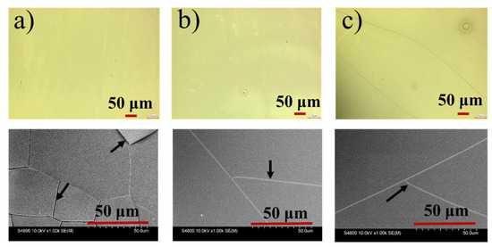 The surface appearances of the Mo6 film, Mo6 film_1.5CS, and Mo6 film_2CS samples observed by the color 3D laser microscope and FE-SEM after drying for similar time of 24 h at room temperature are shown in Figure 6. It should be noted that the SEM observation was conducted in a high vacuum. The yellow Mo6 films seem to be stable despite the appearance of a few hairline cracks in the color 3D laser microscopy images. The stabilization of the films was enhanced after the hydrophilization of the ITO surface. It could be explained that the interaction between the hydrophilic functional groups on the ITO surface and the apical ligands of the octahedral Mo6 cluster units was slightly improved (Figure 2d), however, the PDMS coating has effectively stabilized the Mo6 cluster film on the ITO glass surface for a long time. The existence of bubble contamination is recognized by the circular signs on the surface of the Mo6 film_2CS (Figure 6c (upper)). This problem is not realized in the KF-96L-1.5CS coated Mo6 film. The KF-96L-2CS has higher viscosity that properly reduce the volatile property at the room temperature. This phenomenon was also observed in the Mo6 films coated by the PDMS fluids with a kinetic viscosity higher than 2 CS (Figure 4) even dried at 40 °C for 7 days. As displayed in Figure 6 (lower), the Mo6 film without PDMS appears to have a lot of crack lines, and pieces of the film seem to be separated from the surface of the ITO glass in a high vacuum. In the case of the two PDMS-coated Mo6 films, a few crack lines were presented, but the deposited film strongly adhered to the surface of the ITO glass.