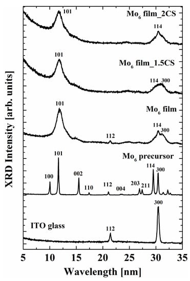 The XRD patterns of the ITO glass, the Mo6 precursor, and the EPD deposits: Mo6 film; Mo6 film_1.5CS; and Mo6 film_2CS samples.