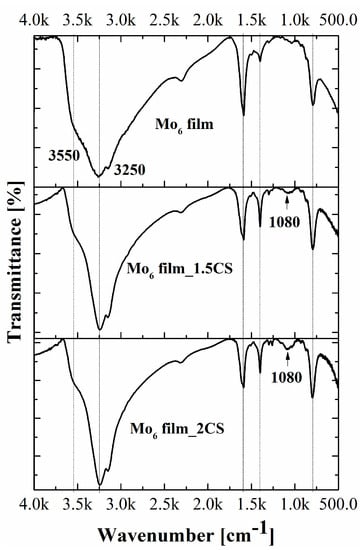 The FT-IR spectrum of the Mo6 film, Mo6 film_1.5CS, Mo6 film_2CS samples.