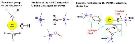 The possible crosslinking mechanism of the PDMS fluid and the Mo6 cluster nanoparticles under the existence of Brønsted acid catalyst.
