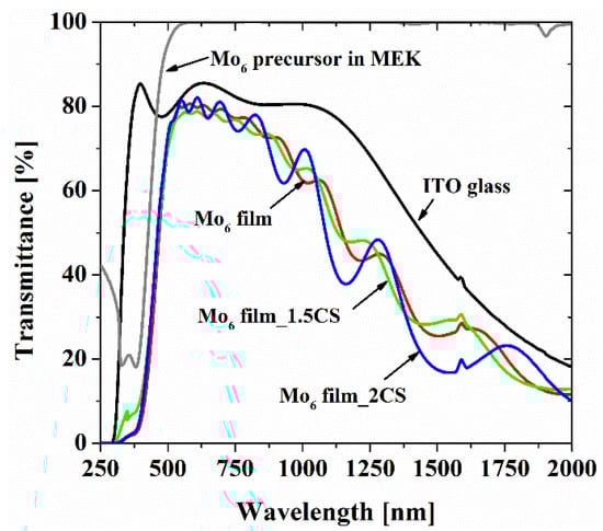 UV-Vis absorption is one of the important technique used to evaluate the influence of the PDMS on the Mo6 film. The absorbance of the Mo6 precursor in the MEK solution and the transmittance of the ITO glass, Mo6 film, Mo6 film_1.5CS, and Mo6 film_2CS samples are presented in Figure 10. The impressive phenomenon in the UV-Vis-NIR transmittance of the film is the appearance of many peaks in the wavelength range from 600 to 2000 nm that does not exist in the spectra of the ITO glass. The interference of the incident and reflected lights by the Mo6 film would give the typical interference pattern []. The increase in the number of interference peaks corresponding to the decrease in the distance between the peaks was recognized when the thickness of the transparent and homogeneous Mo6 film increased. This means that the peaks would disappear if the quality of the Mo6 film was poor. The Mo6 precursor strongly absorbs light in the wavelength range of 300 and 500 nm, while the ITO glass absorbs light at wavelengths under 400 nm and NIR higher than 1100 nm. The transmission curves of the Mo6 film, Mo6 film_1.5CS and Mo6 film_2CS samples display strong absorptions in the wavelength range under 580 nm, which is shifted to about a 40 nm higher wavelength compared to the absorption curve of the Mo6 precursor. This interesting result includes both the absorption by the ITO glass and the Mo6 clusters in the UV-Vis range. Based on these results, it could be suggested that the new cluster network was formed during the EPD process, which is realized in the XRD pattern, caused the different light absorption of the valance electrons in the energy band gap of the Mo6 cluster units. The increase of the absorption in the wavelength of visible light would be an advantage for use in UV-Vis light trapping devices. In addition, the absorption intensity in the NIR range of the Mo6 film is stronger than that of the ITO glass, even if the absorption by the Mo6 cluster precursor does not exist in this range. Mo6 cluster film plays an important role in enhancing and retaining the incident light on the surface of the ITO glass by diffraction and reflection between the ITO layers and the top of the Mo6 film. In summary, the use of the PDMS fluid do not change the optical properties of the Mo6 film.